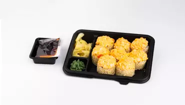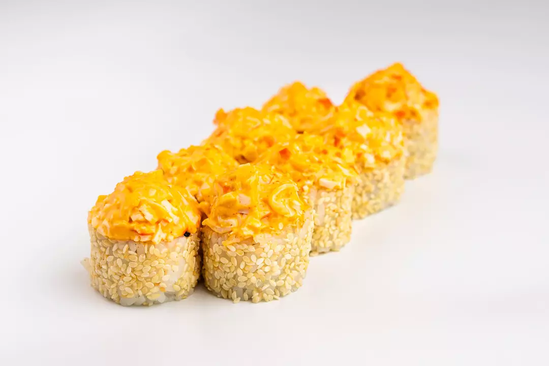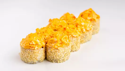 Нежный ролл с шапочкой из опалённых крабовых палочек со спайси-соусом, начинкой из творожного сыра и свежего хрустящего огурца, обваленный в семенах кунжута. Комплектуется с соевым соусом, маринованным имбирем, васаби.