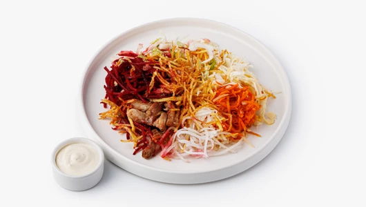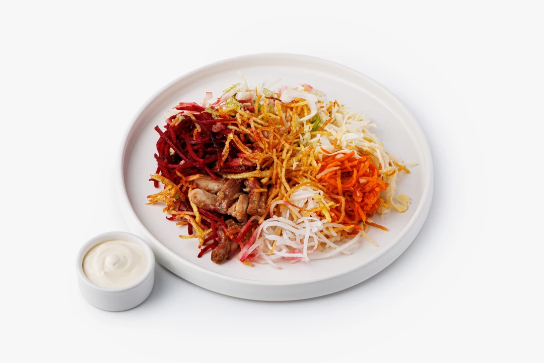 Традиционный салат Красноярска с жареным куриным бедром, свежими овощами и хрустящей картошкой объединяет в себе лучшие черты азиатской и русской кухни. Сочное куриное мясо в соевом маринаде с чёрным перцем сочетается со сладостью отварной свёклы, остротой моркови по-корейски и свежестью пекинской капусты. Хрустящий жареный картофель и нежный дайкон создают контраст текстур, а чесночный соус на сметане и оливковом майонезе мягко связывает все ингредиенты. Салат хорош как полноценный обед или ужин, напоминающий о гостеприимных сибирских застольях.