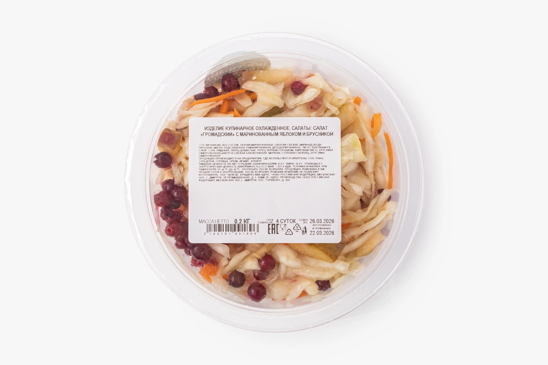 Название салата вдохновлено плодами яблоневого сада в посёлке Громадск Красноярского края, где созревает множество ароматных сортов. Тонко нашинкованную белокочанную капусту с морковью мы дополняем маринованными яблоками с душистым перцем и лавровым листом. Дольки яблок мягкие, с тёплым, пряным вкусом. Ягоды брусники добавляют яркую кислинку и лесную нотку. Этот салат приготовлен на основе старинных сибирских рецептов, где умели сочетать простое и неожиданное: хруст капусты, кисло-сладкое яблоко и брусничную свежесть. Он хорош как лёгкое дополнение к мясу или просто сам по себе — в нём чувствуется северный характер, когда из нескольких простых продуктов получается запоминающееся сочетание.