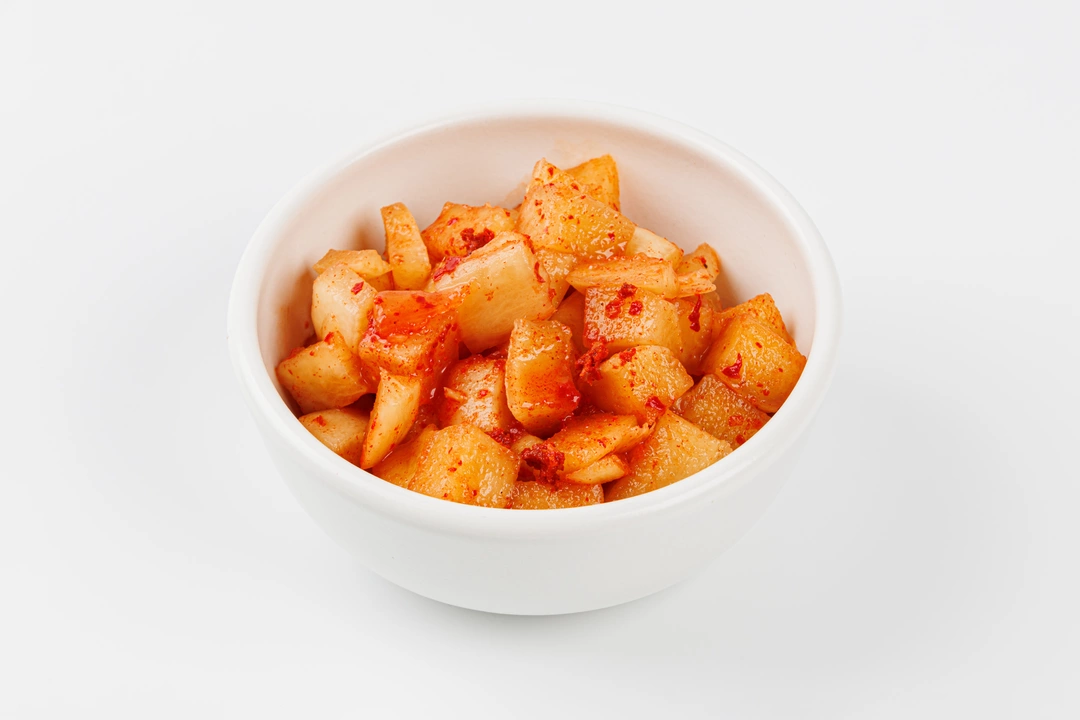 Приготовили салат по классическому рецепту корейской кухни, сохранив во вкусовой композиции баланс между остротой и свежестью. Кубики корнеплода впитали в себя остроту чили, пикантность чеснока и пряные нотки корня имбиря. Можно подавать как самостоятельную закуску или сделать дополнением к основным блюдам. Хрустящая текстура и жгучий характер делают этот салат выразительным и бодрящим.
