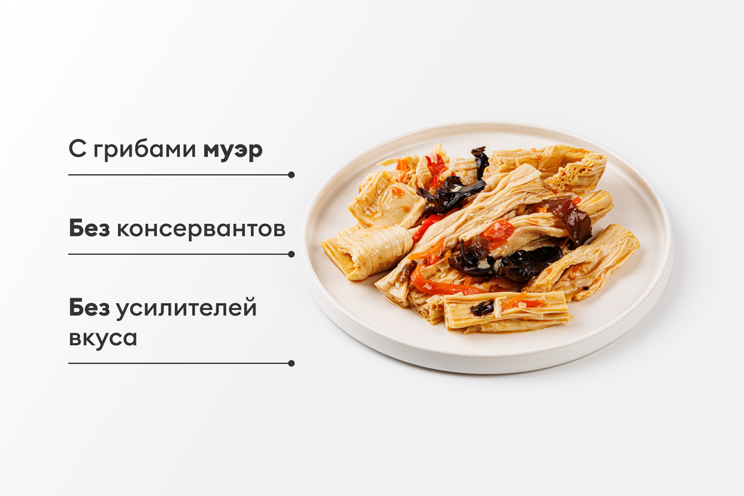 Приготовили традиционный корейский салат из спаржи и грибов муэр с овощами и специями. Состав проверен: нет усилителей вкуса и консервантов