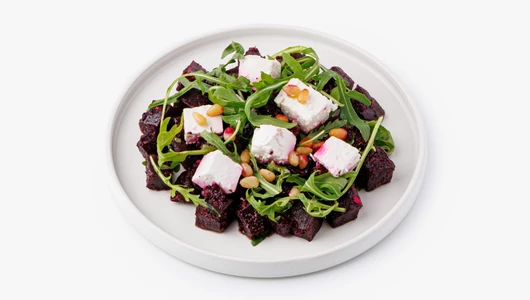 Сладость запечённой свёклы сочетается с кремовой фетой и свежей руколой, а кедровые орешки добавляют салату насыщенный вкус и приятный хруст. Соус на основе зелени, лимонного сока и пармезана подчёркивает вкус овощей и придаёт блюду аромат средиземноморской кухни. Такой салат хорош как лёгкий ужин или яркое дополнение к основному блюду.