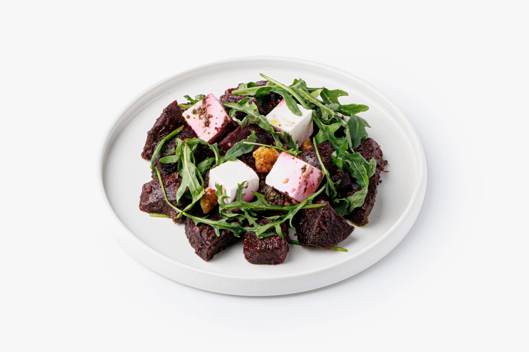 Сладость запечённой свёклы сочетается с кремовой фетой и свежей руколой, а орехи добавляют салату насыщенный вкус и лёгкую хрустящую текстуру. Соус на основе зелени, лимонного сока и пармезана подчёркивает вкус овощей и придаёт блюду аромат средиземноморской кухни. Такой салат подойдёт как лёгкий ужин или яркое дополнение к основному блюду.