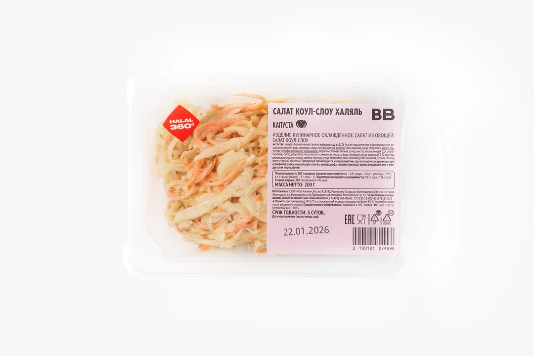 Классический коул-слоу в халяль-исполнении — свежий, хрустящий и сбалансированный по вкусу. Тонко нашинкованная белокочанная капуста и сочная морковь создают плотную, хрустящую основу. Сливочная заправка на майонезе с дижонской горчицей и апельсиновым нектаром даёт мягкую кисло-сладкую ноту. Чеснок звучит деликатно, не перебивая основной вкус. Готов к употреблению — просто перемешайте перед подачей. Подойдёт как лёгкий гарнир к мясу, птице или рыбе, а также как самостоятельная закуска для тех, кто любит сочные овощные салаты.