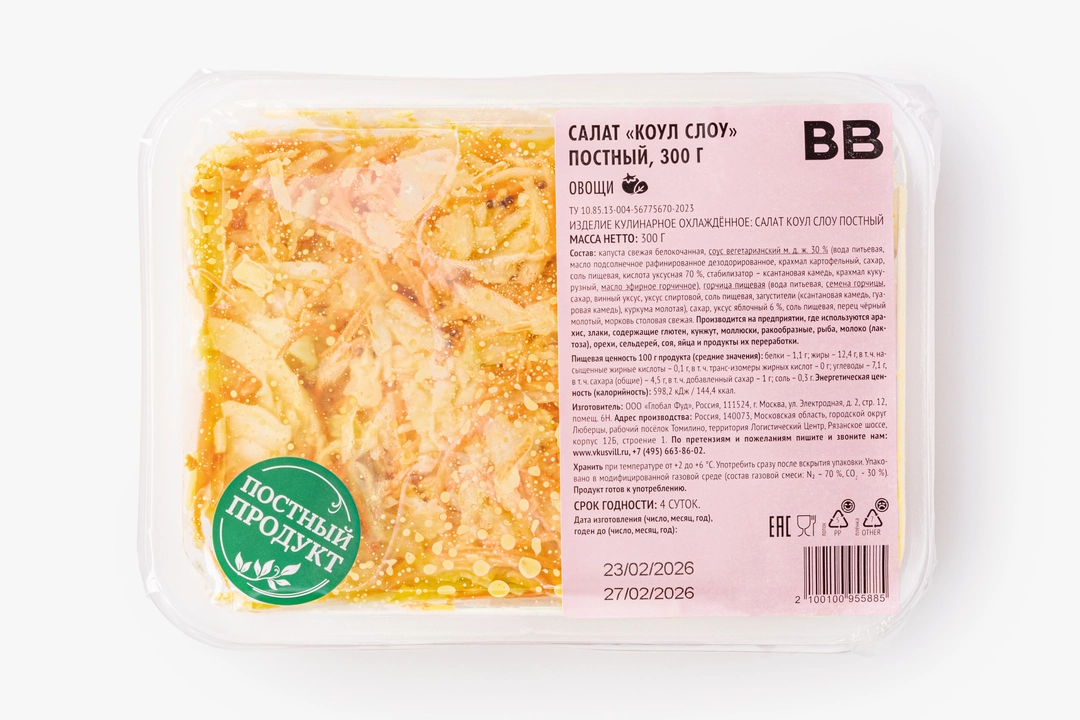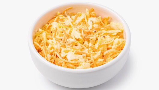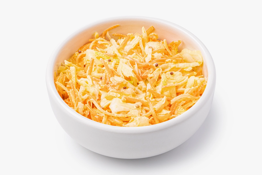 Свежая белокочанная капуста и морковь нарезаны тонкой соломкой и заправлены вегетарианским соусом с добавлением горчицы и яблочного уксуса. Его лёгкая кислинка подчёркивает естественную сладость овощей, а чёрный перец в составе блюда даёт небольшую остроту. Соус без использования продуктов животного происхождения добавляет хрустящим компонентам чуть больше нежности и мягкости. Салат с классическим сочетанием простых ингредиентов подходит для подачи с бургерами, а также как самостоятельное блюдо в сочетании с хрустящим хлебом или лепёшкой.