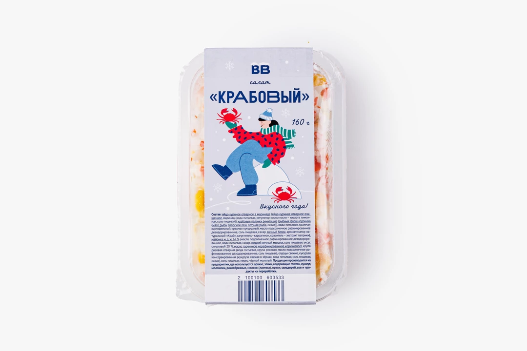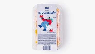 «Крабовый» — один из самых популярных салатов. Рецепт его довольно прост, но времени на подготовку ингредиентов уходит немало. Поэтому мы сделали это за вас. Состав — самый что ни на есть домашний: крабовые палочки, рис, варёные яйца, консервированная кукуруза и свежие огурцы. А для заправки выбран натуральный майонез.