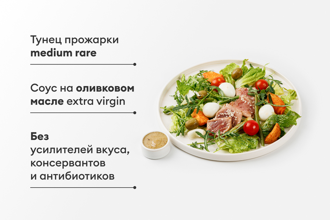 Блюдо из линейки «Коллекция вкусов». Ломтики тунца с беби-картофелем, оливками, черри, перепелиным яйцом и кенийской фасолью. Тунец предварительно выдерживается в маринаде, а затем обжаривается до состояния medium rare, поэтому остаётся сочным внутри. Салат подаётся на подушке из сочных листовых овощей под соусом из оливкового масла Extra Virgin с горчицей, лимонным соком и анчоусами. «Коллекция вкусов» — это новая линейка готовых блюд. Её разработали бренд-шефы ВкусВилла, посвятившие себя искусству создания кулинарных произведений. Еда, готовая удивлять!