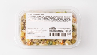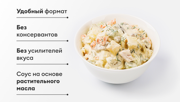 Наш салат «Оливье» приготовлен с добавлением кусочков мягкой отварной говядины, куриной грудки и сочной ветчины из свинины. Приправлен соусом на основе растительного масла. Без ароматизаторов, усилителей вкуса и консервантов