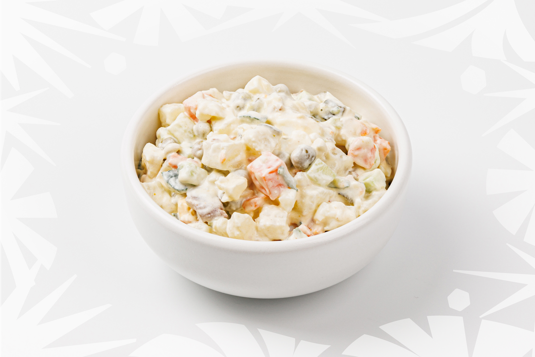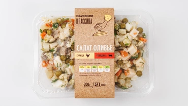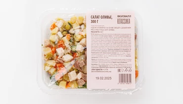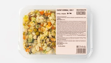 ГЛОБАЛ ФУД ООО: майонез массовая доля жира 50 % (масло подсолнечное рафинированное дезодорированное, вода питьевая, сахар, яичный желток, соль пищевая, крахмал картофельный, регулятор кислотности – уксусная кислота), картофель отварной, яйцо куриное пищевое, горошек зелёный консервированный (горошек свежий зелёный мозговых сортов, соль пищевая, вода питьевая), ветчина из мяса птицы (кусковое мясо птицы (филе куриное, вода питьевая, соль пищевая, сахар, мускатный орех, перец чёрный молотый)), морковь столовая отварная, филе куриной грудки отварное, говядина 1-го сорта отварная, огурцы консервированные (огурцы свежие, уксус столовый 9 %, соль пищевая, сахар, гвоздика, чеснок свежий, перец чёрный горошек, вода питьевая), огурцы свежие, укроп свежий, петрушка свежая, соль пищевая, перец чёрный молотый. Продукт производится на предприятии, где используются горчица, злаки, кунжут, орехи, арахис, моллюски, ракообразные, рыба, сельдерей, соя, молоко и продукты их переработки. ГАСТРОФАБРИКА ООО: картофель отварной, майонез м.д.ж. 67 % (масло подсолнечное рафинированное дезодорированное, вода питьевая, сахар, яичный желток сухой, соль пищевая, горчичный порошок, уксус столовый 9%), морковь столовая отварная, яйцо куриное отварное в маринаде (яйцо куриное пищевое очищенное, маринад (вода питьевая, регулятор кислотности - лимонная кислота, соль пищевая)), ветчина из мяса птицы (мясо кур (филе окорочка, филе голени), вода питьевая, соль пищевая, чеснок свежий, перец чёрный молотый), горошек зелёный консервированный (горошек зелёный мозговых сортов, вода питьевая, сахар, соль пищевая), филе куриной грудки отварное, огурец солёный (огурец свежий, вода питьевая, соль пищевая, семена укропа, чеснок сушёный), огурец свежий, говядина отварная (произведено из мороженого сырья), укроп свежий (зелень), петрушка свежая (зелень), соль пищевая. Продукция производится на предприятии, где используются кунжут, злаки, содержащие глютен, молоко (лактоза), рыба, орехи, сельдерей, соя, арахис, ракообразные. ИНГРЕДИКА ООО: майонез м. д. ж. 50 % (масло подсолнечное рафинированное дезодорированное, вода питьевая, сухой яичный меланж, сахар, соль пищевая, кислота уксусная 70 %, масло эфирное горчичное), картофель отварной (вода питьевая, картофель свежий, соль пищевая), яйцо куриное отварное, горошек зелёный консервированный (горошек свежий зелёный мозговых сортов, соль пищевая, вода питьевая), ветчина из мяса птицы (кусковое мясо птицы (филе куриное, вода питьевая, соль пищевая, сахар, мускатный орех молотый, перец чёрный молотый)), морковь столовая отварная (вода питьевая, морковь столовая свежая, соль пищевая), филе куриной грудки отварное (вода питьевая, филе куриной грудки, соль пищевая), говядина отварная (вода питьевая, говядина (произведено из охлаждённого сырья), соль пищевая), огурцы маринованные (огурцы свежие, уксус столовый 9 %, соль пищевая, сахар, гвоздика, чеснок свежий, перец чёрный (горошек), вода питьевая), огурцы свежие, укроп свежий (зелень), петрушка свежая (зелень), соль пищевая, перец чёрный молотый. Продукция производится на предприятии, где используются арахис, злаки, содержащие глютен, кунжут, моллюски, ракообразные, рыба, молоко (лактоза), орехи, сельдерей, соя. ГУД ФУД ООО: майонез м. д. ж. 67 % (масло подсолнечное рафинированное дезодорированное, вода питьевая, сахар, яйцо курино