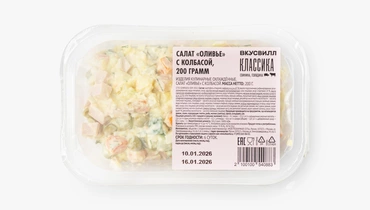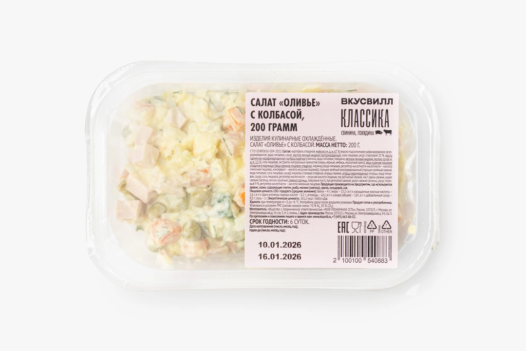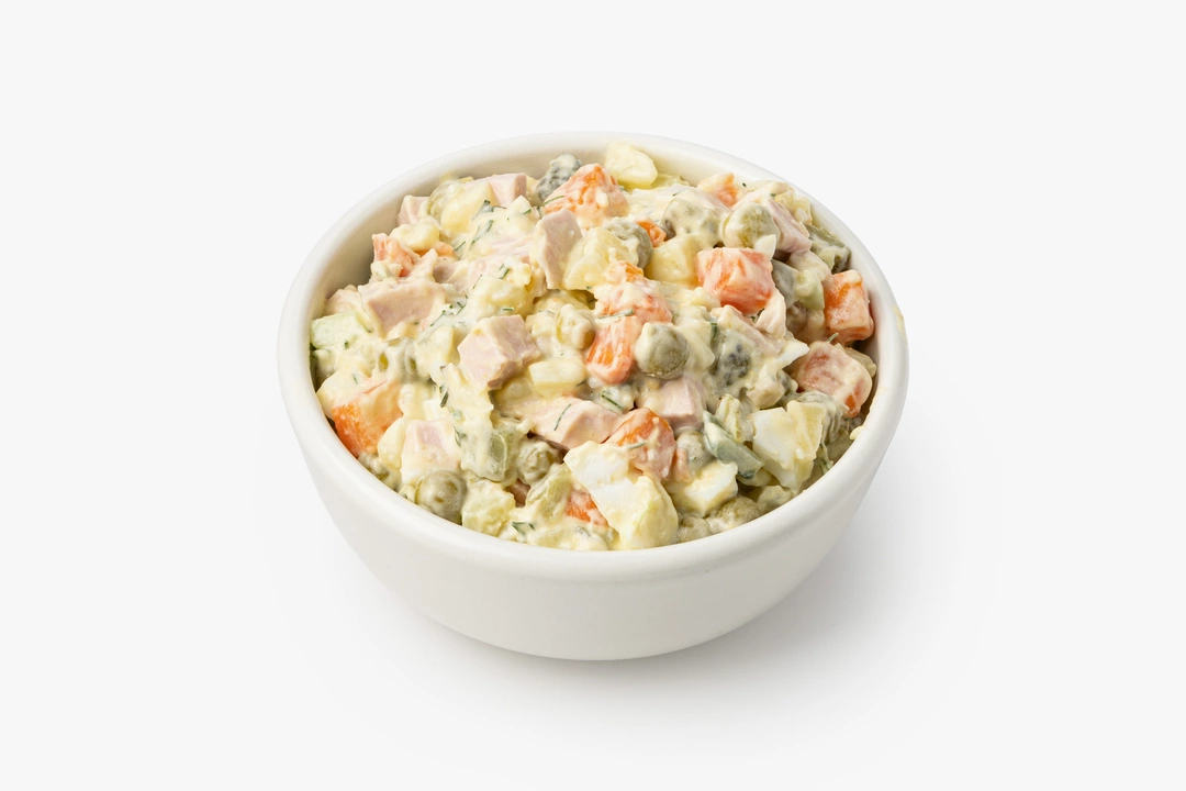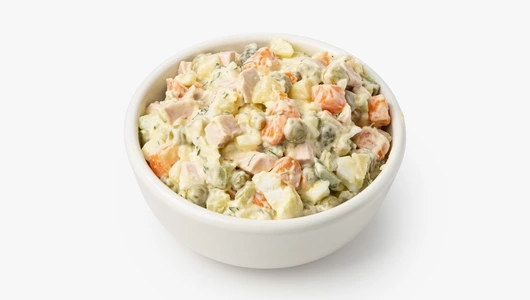 Необязательно дожидаться праздников, чтобы побаловать себя этим легендарным салатом. Ведь мы заботливо приготовили его по домашнему рецепту: с натуральной варёной колбасой, консервированным горошком и пикантным лучком. А чтобы разрешить споры между теми, кто добавляет в оливье маринованные огурцы, и теми, кто предпочитает свежие, мы добавили и те, и другие освежив привычную рецептуру.