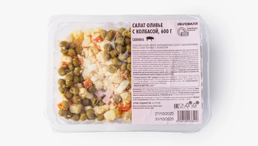 «Оливье» не сложный и любимый многими салат уже стал классикой. Но из-за обилия ингредиентов, требующих предварительного приготовления, для того, чтобы порадовать семью и гостей таким салатом, придется провести на кухне немало времени. Мы предлагаем уже готовый вариант, одобренный поваром «ВкусВилл». Салат приготовлен из свежих и натуральных продуктов. Без консервантов и усилителей вкуса. Большой объем отлично подойдет для праздничного стола.