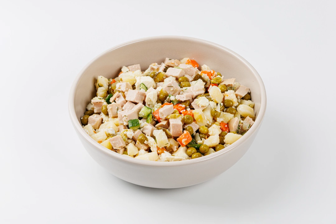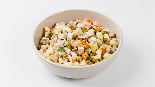Большая порция легендарного салата, которую осталось только заправить майонезом или другим соусом по вашему вкусу. Поможет сэкономить бесценное время на готовке и при этом подать салат максимально свежим, как если бы вы только что его нарезали.
