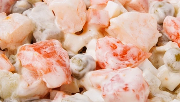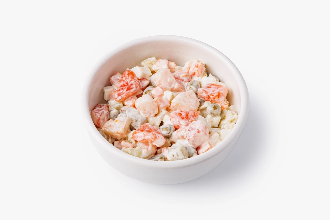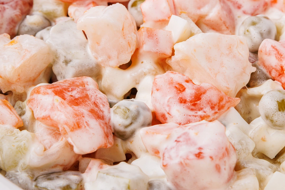В этом варианте оливье его классический вкус становится более утончённым. Мы добавили кусочки слабосолёной красной рыбы и нежные креветки, чтобы салат ощущался по-настоящему праздничным. Картофель, свежие и маринованные огурцы, яйцо и горошек создают знакомую основу, а форель и креветки вносят нотку оригинальности. Такой салат хорошо вписывается в предновогоднюю атмосферу — яркий и более изысканный, чем привычная классика.