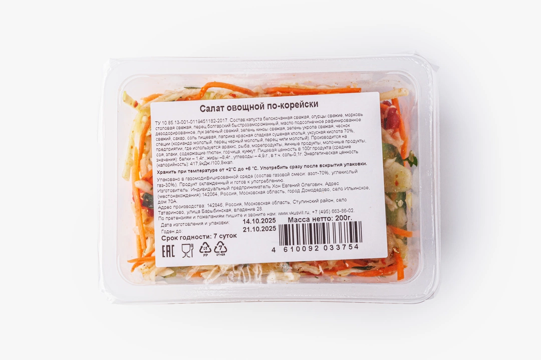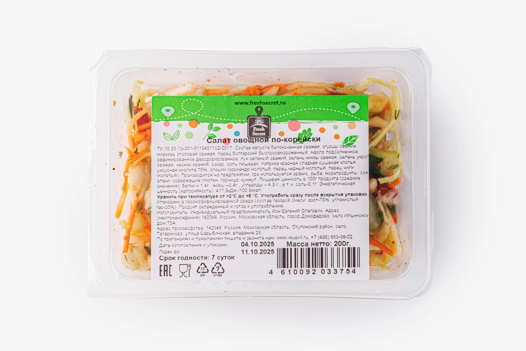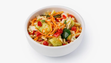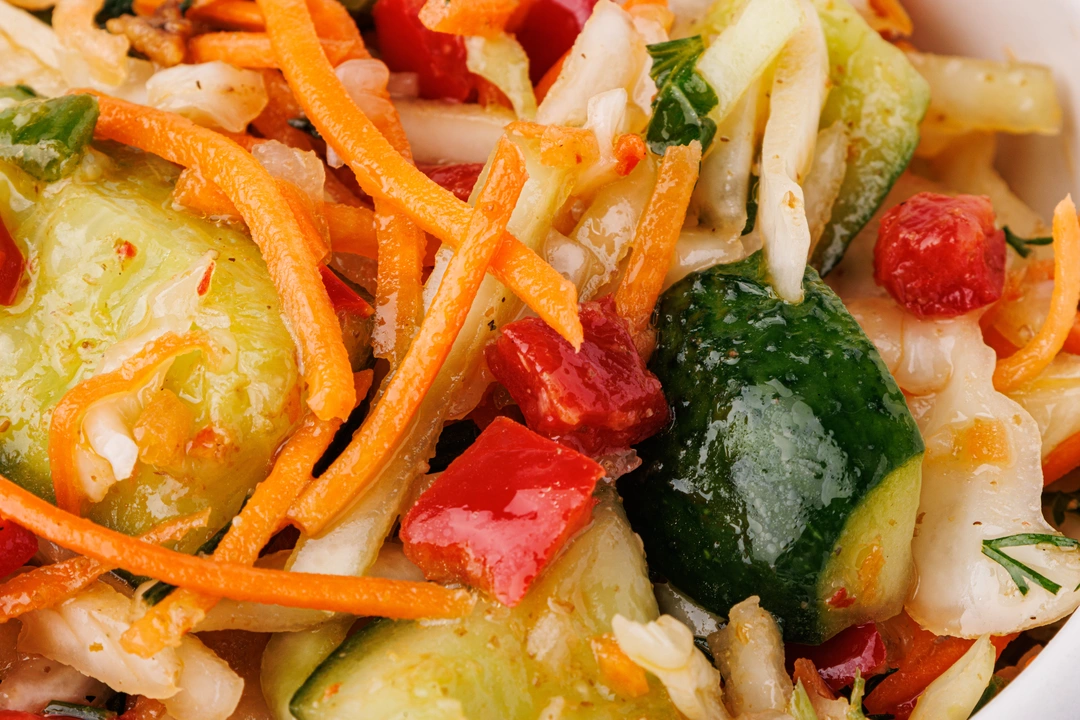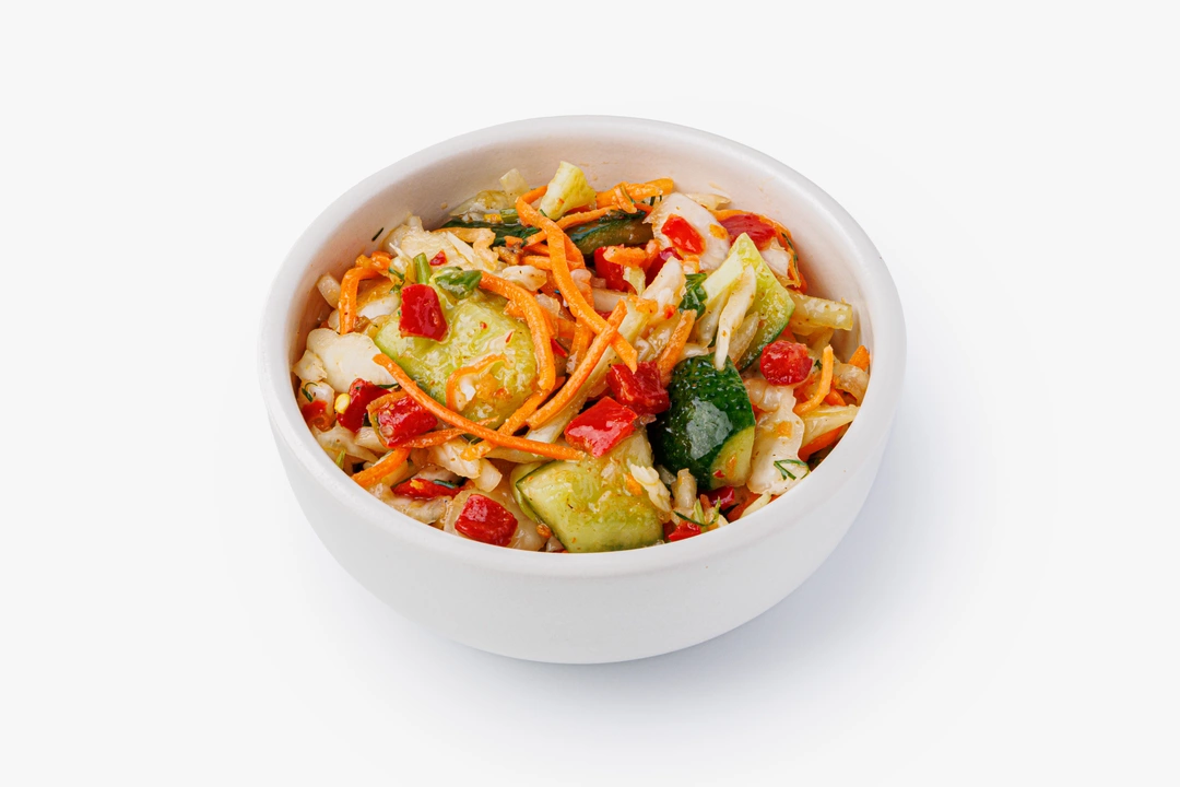 Свежий овощной салат с хрустящей капустой, огурцами и болгарским перцем в острой корейской заправке. Чеснок, кориандр и хлопья паприки создают яркий аромат и насыщенный вкус, а зелень кинзы и укропа добавляет свежесть. Салат получается лёгким, пряным и сочным. Это отличная холодная закуска к основным блюдам.