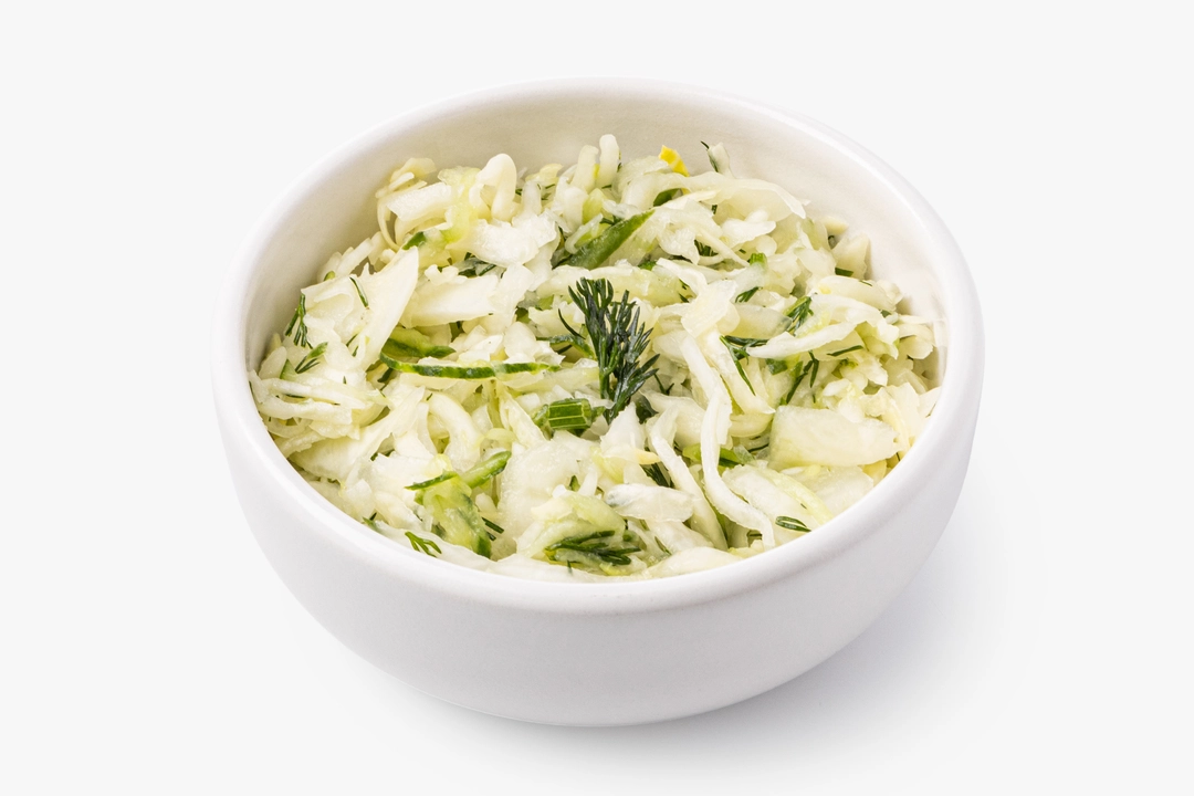 Свежий овощной салат — это частичка лета на вашем столе. Мы нарезали капусту и огурец, положили рубленый укроп и заправили подсолнечным маслом с лимонным соком. Щепотка сахара и соли подчёркивает естественный вкус овощей. Салат можно подавать в качестве закуски или как лёгкий гарнир к мясу, рыбе или картофелю. Он разнообразит ваше меню и добавит в него сочных красок