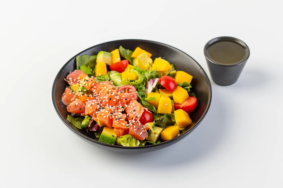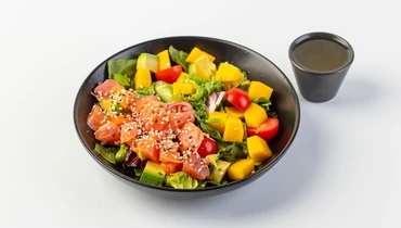 Основу салата составляет необычное сочетание сочного манго и нежной малосолёной форели. Мы добавили в него кусочки авокадо, свежие листья салата и томаты черри для придания вкусу ещё большей выразительности. Заправка с лимонным соком, молотым перцем и базиликом вносит пикантный акцент. Салат можно подать в качестве дополнения к обеду, лёгкого ужина или гарнира к блюдам из рыбы и морепродуктов.