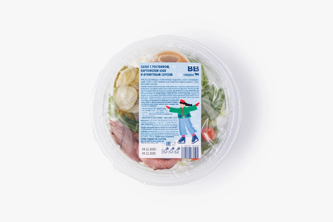 В этом салате сочные ломтики ростбифа сочетаются с запечённым картофелем бэби, сладковатыми томатами черри и свежей смесью салатных листьев: айсберга, романо, шпината и рукколы. Маринованные огурцы добавляют лёгкую пикантность, а ореховые нотки кунжутного соуса раскрывают вкус мяса и овощей. Перед подачей салат можно слегка перемешать, чтобы каждый кусочек пропитался соусом, а текстуры и оттенки вкуса сложились в гармоничную композицию. Такой салат подойдёт для лёгкого обеда или ужина, когда хочется чего-то свежего и насыщенного одновременно.