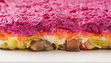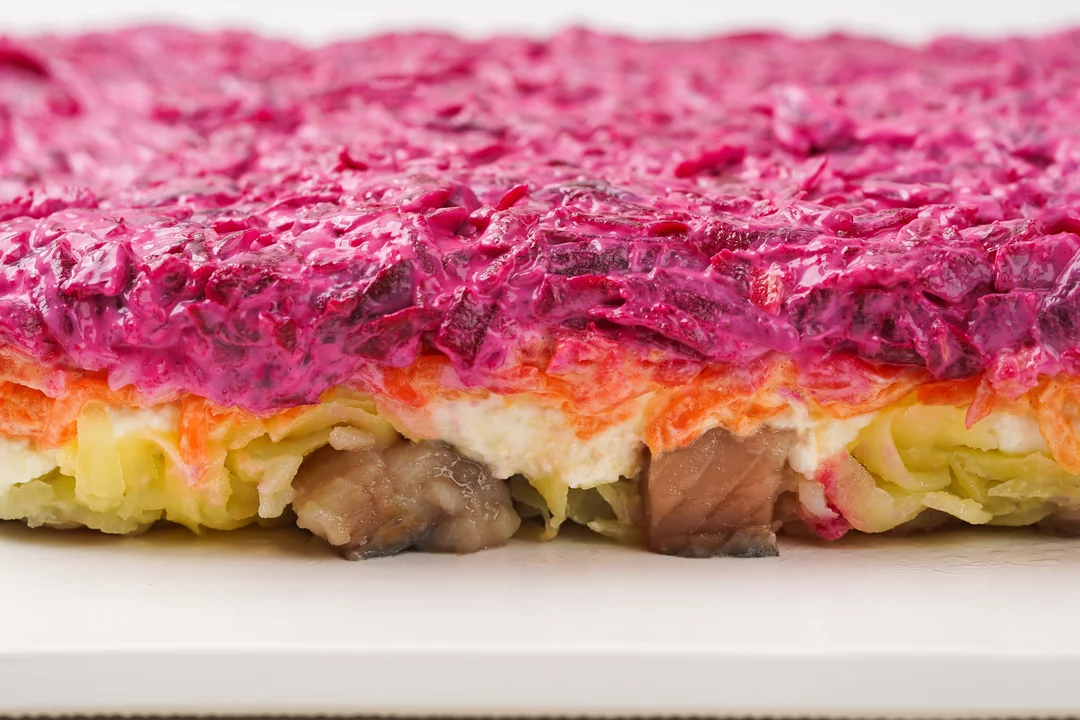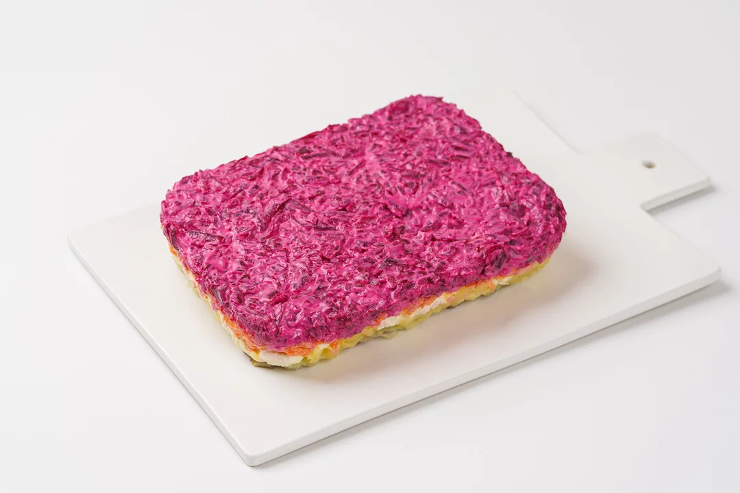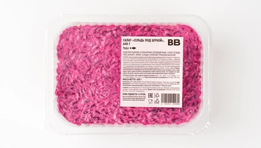 Большая порция традиционного праздничного салата. Сладковатая свёкла оттеняет нежное слабосолёное филе сельди в масле. Отварной картофель и морковь добавляют сытности, а майонезная заправка делает блюдо мягким и сочным. Переложите продукт в прозрачный салатник для эффектной подачи — так будут видны все слои. К салату можно предложить ломтики ржаного или зернового хлеба. Порции в 600 г хватит на компанию из 3–4 человек.