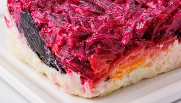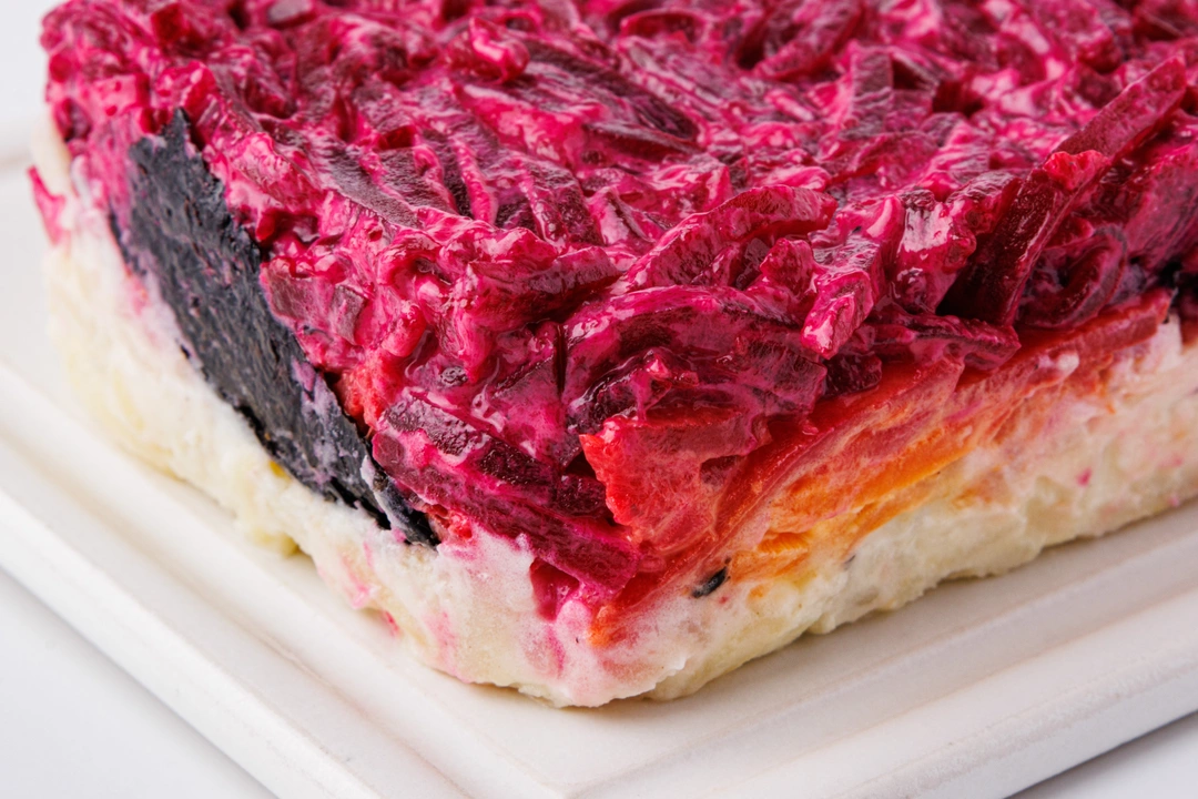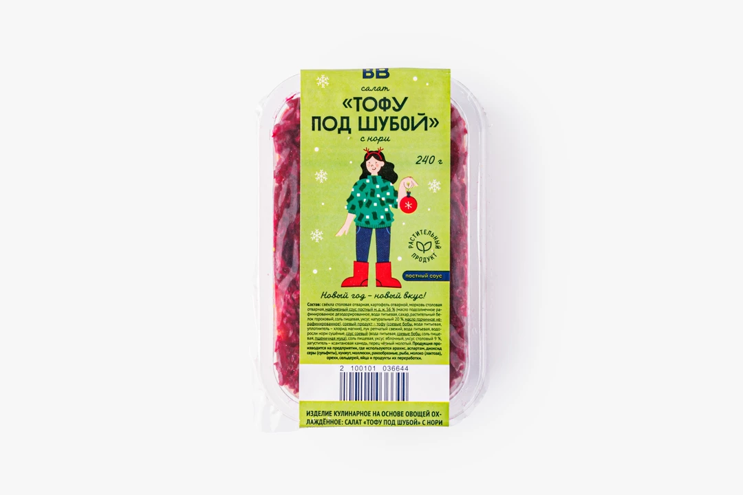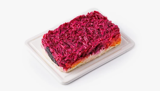 Этот салат — как новогодний подарок для тех, кто ищет свежие вкусы в знакомой классике. Растительная вариация на тему советской «шубы» с японским акцентом создаёт праздничное настроение даже без традиционных ингредиентов. Водоросли нори добавляют лёгкий морской аромат, а сочетание варёной свеклы, картофеля и моркови сохраняет уют зимнего застолья. Нежный тофу придает блюду мягкую белковую основу и гармонично вписывается в слоёную структуру. Свежий лук даёт немного пикантности, а постный майонез на гороховом белке с горчичным маслом объединяет все слои в аппетитную композицию. Такой салат украсит праздничный стол — когда хочется чего-то родного, но с изюминкой, и когда огни гирлянд отражаются в тёмном окне, создавая ту самую новогоднюю магию.