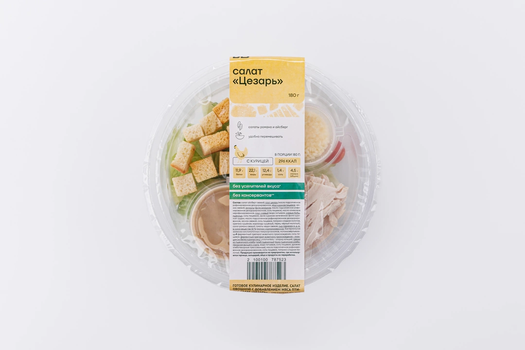 ФЛАЙ СЕРВИС ООО: салат романо свежий, салат айсберг свежий, филе куриное запечённое (филе куриной грудки, сок лимона прямого отжима, перец чёрный молотый, соль пищевая, вода питьевая), томаты черри свежие, сыр пармезан молодой м. д. ж. в сухом веществе 40 % (пастеризованное коровье молоко, соль пищевая, мезофильные молочнокислые микроорганизмы, молокосвёртывающий ферментный препарат животного происхождения – лизоцим (из белка куриных яиц)), гренки из пшеничного хлеба (хлеб пшеничный (мука пшеничная хлебопекарная в/с, вода питьевая, соль пищевая, дрожжи хлебопекарные прессованные), масло подсолнечное рафинированное дезодорированное, зелень сушёная (укроп, лук), экстракт розмарина), соус цезарь (масло подсолнечное рафинированное дезодорированное, яйцо куриное пищевое, соус соевый (вода питьевая, бобы соевые, пшеница, соль пищевая, сахар), анчоусы (филе анчоусов, масло подсолнечное рафинированное дезодорированное, соль пищевая), горчица столовая (вода питьевая, горчичный порошок, масло подсолнечное рафинированное дезодорированное, соль пищевая, уксус столовый 9 %), сок лимона прямого отжима, вода питьевая, сахар, чеснок свежий). Продукция производится на предприятии, где используются кунжут, орехи, сельдерей. СМАРТ ФУД СОЛЮШНЗ ООО: салат романо свежий, салат айсберг свежий, филе куриное запечённое (филе куриное, сок лимона прямого отжима, перец чёрный молотый, соль пищевая, вода питьевая), томаты черри свежие, сыр пармезан молодой м. д. ж. в сухом веществе 40 % (молоко пастеризованное коровье, соль пищевая, мезофильные молочнокислые микроорганизмы, молокосвёртывающий ферментный препарат животного происхождения, ферментный препарат животного происхождения – лизоцим (из белка куриных яиц)), гренки из пшеничного хлеба (хлеб пшеничный (мука пшеничная хлебопекарная высшего сорта, вода питьевая, соль пищевая, дрожжи хлебопекарные прессованные), масло подсолнечное рафинированное дезодорированное, соль пищевая, зелень сушёная (укроп, лук зеленый), антиокислитель – экстракт розмарина), соус цезарь (масло подсолнечное рафинированное дезодорированное, меланж яичный жидкий, соус соевый (вода питьевая, бобы соевые, пшеница, соль пищевая, сахар), анчоусы (филе анчоусов, масло подсолнечное рафинированное дезодорированное, соль пищевая), горчица столовая (вода питьевая, горчичный порошок, масло подсолнечное рафинированное дезодорированное, соль пищевая, уксус столовый 9 %), сок лимона прямого отжима, вода питьевая, сахар, чеснок свежий). ЧИКЕН ФЭКТОРИ ООО: салат (салат айсберг свежий, салат романо свежий, филе куриное запечённое (филе куриной грудки, масло подсолнечное рафинированное дезодорированное, чеснок сушёный молотый, соль пищевая, паприка сладкая), томаты черри свежие, сыр пармезан м. д. ж. в сухом веществе 40 % (молоко коровье пастеризованное, молочнокислые бактерии, соль пищевая, уплотнитель – хлорид кальция, комплексный молокосвёртывающий фермент микробного происхождения), гренки пшеничные (мука пшеничная хлебопекарная высшего сорта, вода питьевая, сахар, дрожжи хлебопекарные, соль пищевая, масло подсолнечное рафинированное дезодорированное, чеснок сушёный молотый)), соус «Цезарь» (масло подсолнечное рафинированное дезодорированное, горчица столовая (вода питьевая, семена горчицы, спиртовой уксус, соль пищевая, специи (куркума молотая),