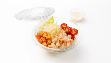 Классический салат с обжареными креветками, хрустящими листьями Айсберга, помидорами черри, чесночными гренками и тертым пармезаном, сдобренный соусом Цезарь.