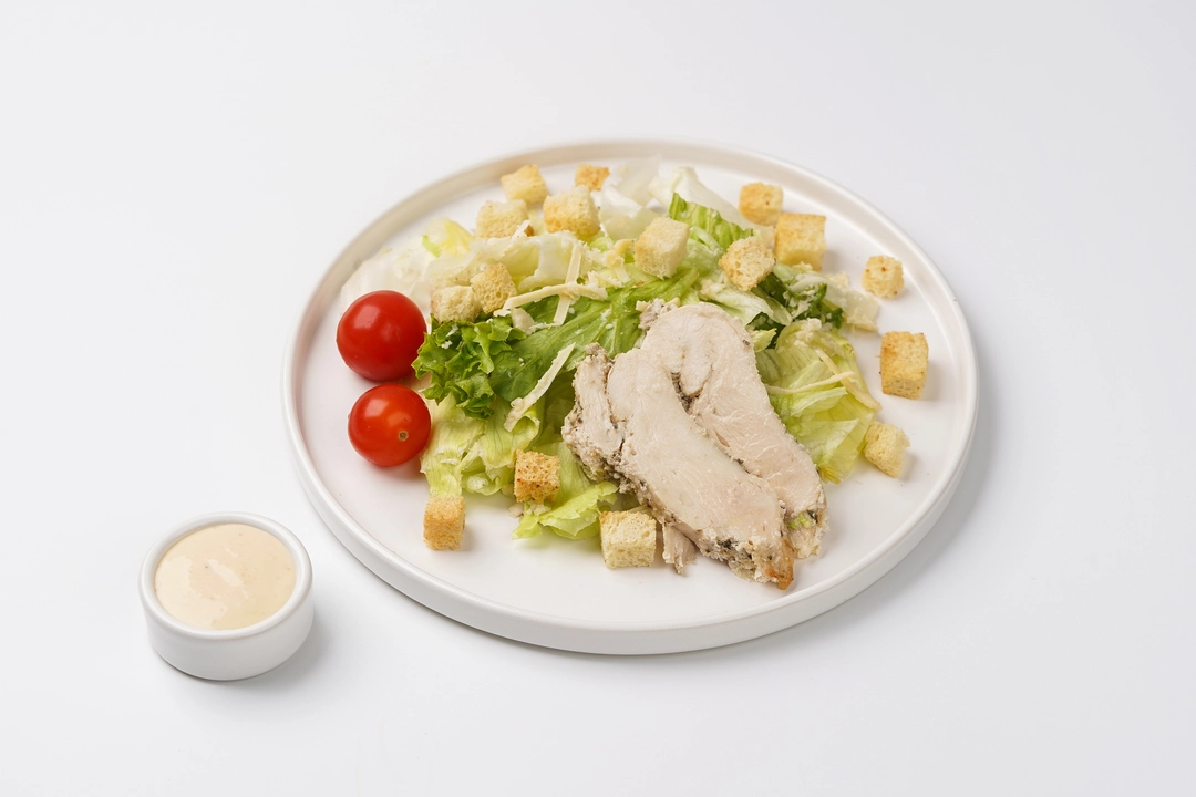 Один из самых популярных салатов с классическим составом. В основе — нежное куриное филе со свежими томатами черри, листьями салата, чесночными гренками и стружкой пармезана. Узнаваемый вкус даёт соус «Цезарь» — особая пряная заправка, приготовленная по авторскому рецепту с анчоусами и ворчестерским соусом. Беспроигрышный вариант для быстрого обеда или сытного перекуса.