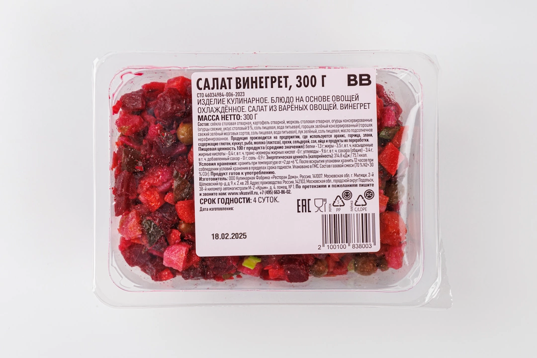 В нашем винегрете те же ингредиенты, что вы используете дома. Готовим по традиционному рецепту: из отварных корнеплодов с консервированными огурчиками, горошком и небольшим количеством ароматного масла. Чистый состав без добавленного сахара, вкусоароматических усилителей и консервантов.