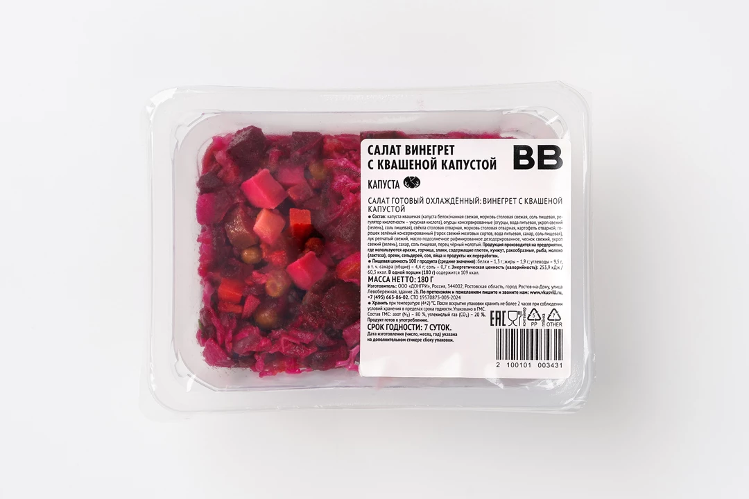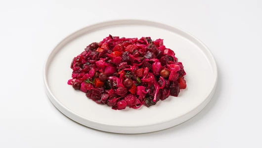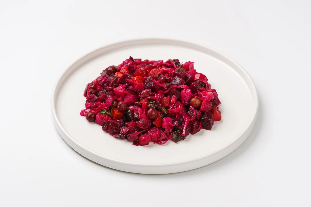 Классический винегрет с квашеной капустой — яркий салат с насыщенным вкусом, где сочетаются сладость отварной свеклы, морковки и картофеля, пикантность квашеной капусты и огурцов, а также свежесть зелёного горошка и лука. Немного чеснока и укропа добавляют аромат, а подсолнечное масло мягко объединяет все ингредиенты, подчёркивая их натуральность.