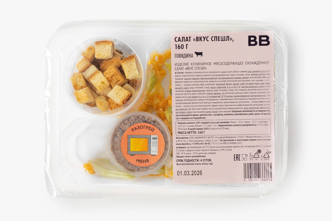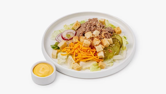 Сытный салат с говяжьим фаршем, хрустящими гренками и овощами может напомнить вам по вкусу один легендарный бургер. Основа из айсберга остаётся сочной и свежей, говядина даёт насыщенный мясной вкус, а маринованные огурцы и красный лук добавляют яркие кисло-сладкие акценты. Сыр чеддер и кунжут делают вкус более выразительным, а жареный лук добавляет текстурный контраст. И изюминка салата — это знаменитый соус из самого известного в мире двойного бургера, его вкус — символ целой эпохи фастфуда. Мы приготовили свою версию культовой бургерной заправки для салата на основе майонеза с добавлением сладкого горчичного соуса, мелко нарезанных корнишонов, уксуса, чесночного порошка, лукового порошка и паприки. Она идёт отдельно, чтобы было удобно добавить по вкусу. И фарш мы тоже положили в отдельный контейнер — вам будет легко разогреть только его перед подачей. Такой салат получается ярким и самодостаточным, при этом в каждом его ингредиенте чувствуется собственный характер.