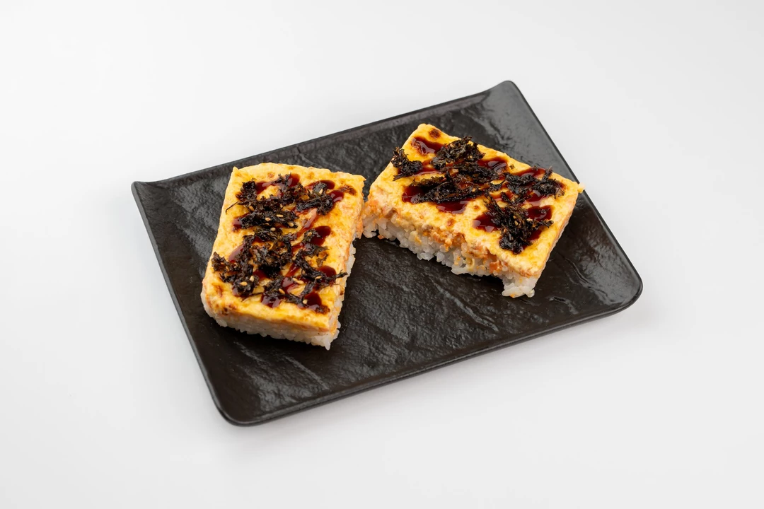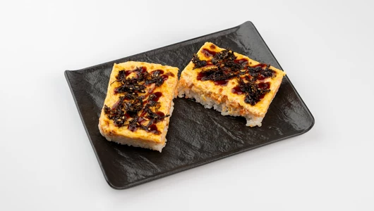 Острый и сытный суши-салат на основе японского отварного риса, заправленный кисло-сладким соусом, с начинкой из рубленого слабосоленого лосося в спайси-соусе, и запеченный под перечно-сырной шапкой с пикантной остринкой. Комплектуется с хрустящим жареным нори и кунжутом.