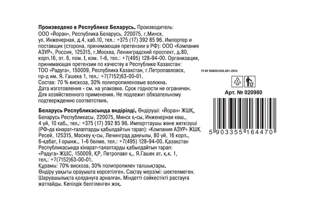 Набор универсальных вискозных салфеток для сухой и влажной уборки. Высокая плотность позволяет салфетке впитывать большое количество влаги. Большой размер подойдет для уборки больших площадей. Страна-производитель Беларусь