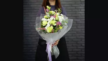 Сборный букет из эустомы, маттиолы, астромерии и гвоздики