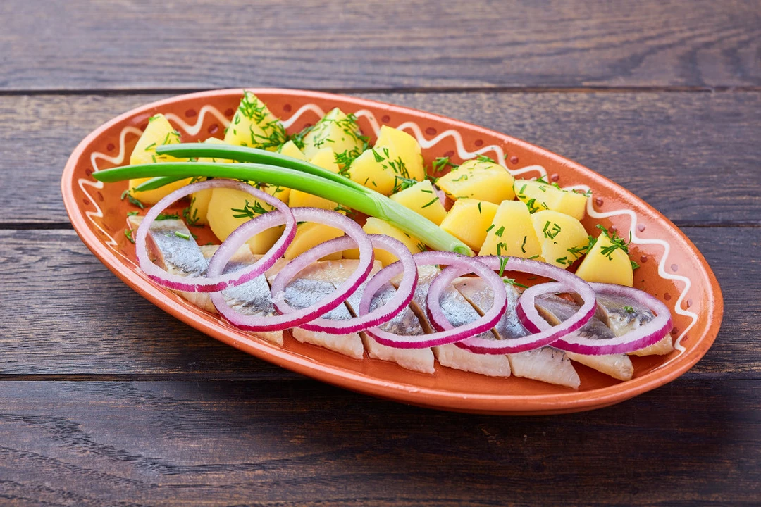 Сельдь домашнего посола с отварным картофелем и маринованным луком