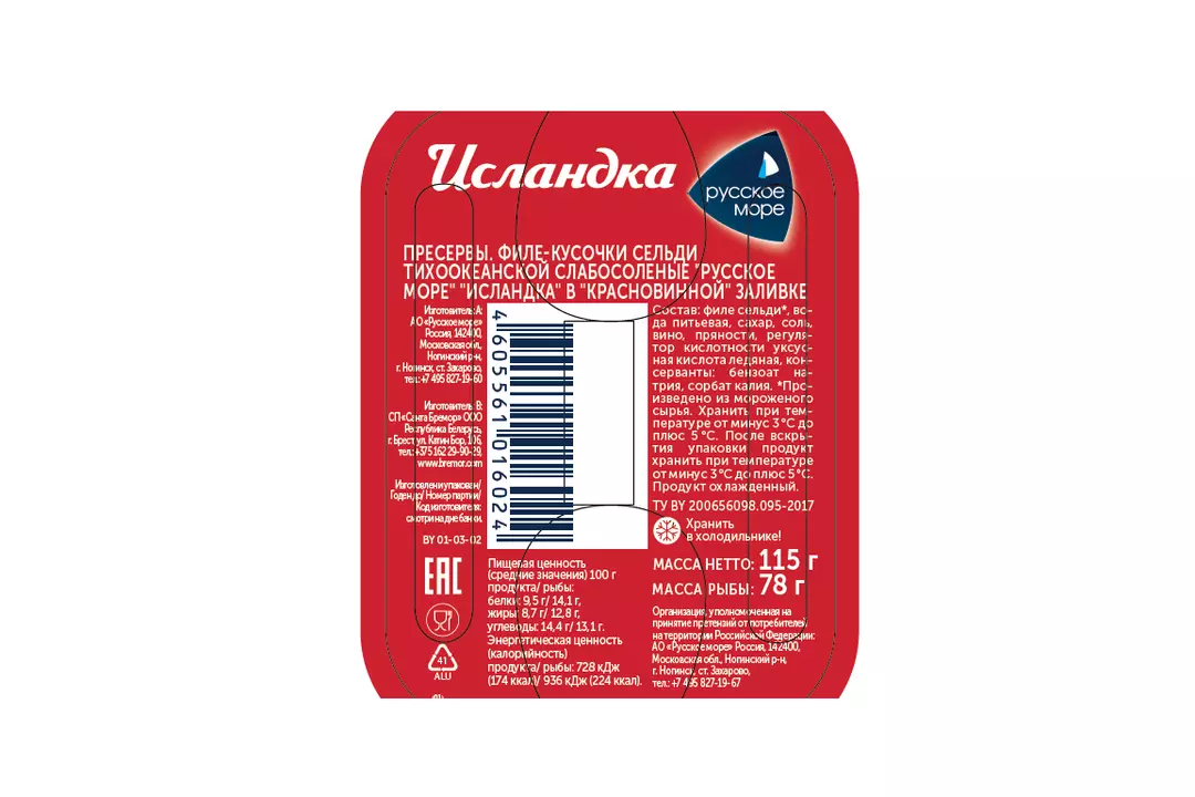 Кусочки идеальной нарезки из филе сельди в «красновинной» заливке, приготовленного по традиционному исландскому рецепту, имеющему многовековую историю. Имеет ни с чем не сравнимую вкусовую гамму, обусловленную оригинальной винной заливкой. Удобная современная упаковка с ключом для открывания. Чистый вес продукта 78 г