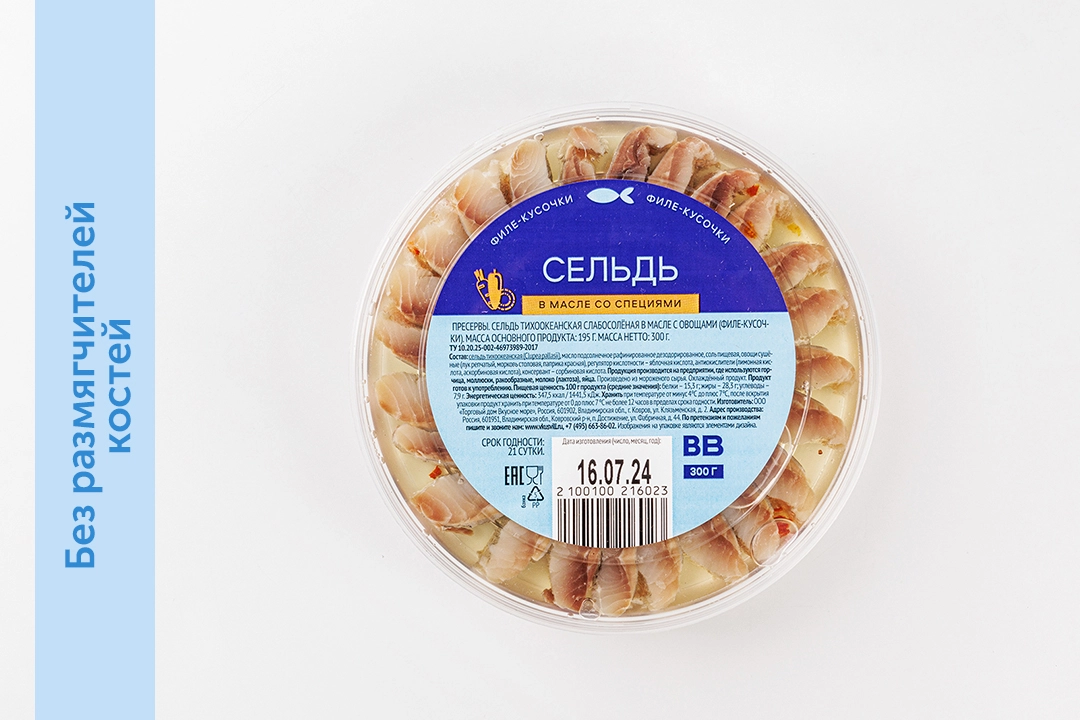 Нежное филе тихоокеанской сельди в заливке из подсолнечного масла с сушёными овощами и горчичными семенами. Мы зачищаем филе, но делаем это без применения химических веществ. Поэтому в рыбе могут оставаться мелкие косточки.