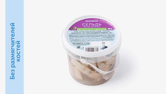 Нежное филе тихоокеанской сельди уже нарезано удобными кусочками и заправлено подсолнечным маслом. В качестве акцента — немного репчатого лучка и укропа. Подходит для бутербродов на бородинском хлебе и в пару к отварному картофелю. Не содержит бензойной кислоты и вкусоароматических усилителей. Мы зачищаем филе, но делаем это без применения химических веществ. Поэтому в рыбе могут оставаться мелкие косточки.