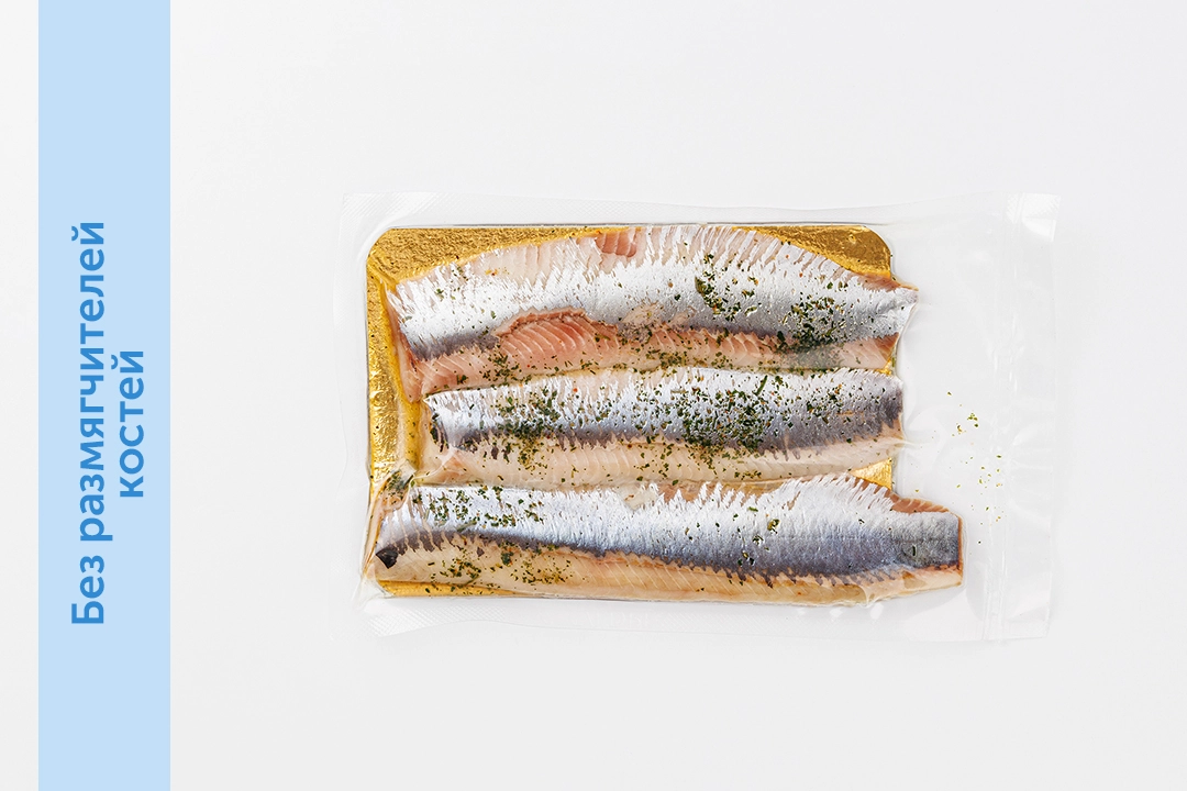 В селёдке от ВкусВилла нет вкусоароматических усилителей, химических размягчителей костей и бензойной кислоты. Готовим с натуральными приправами: сушёными овощами и петрушкой.