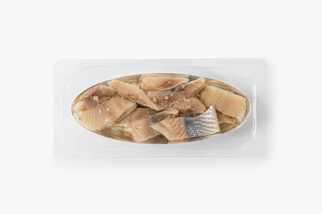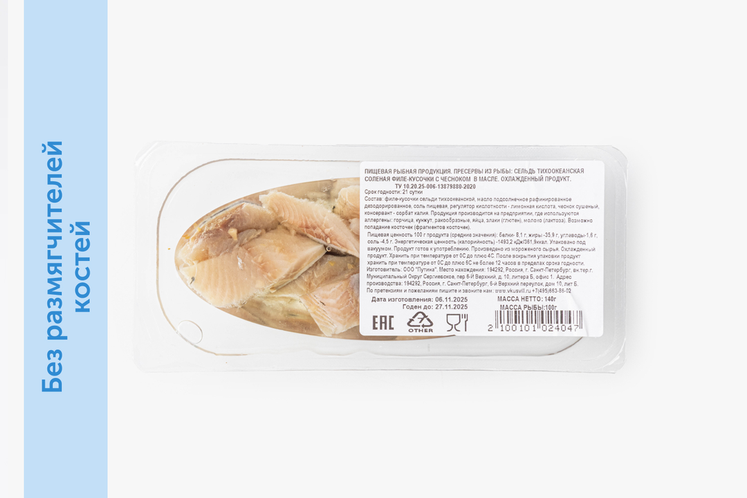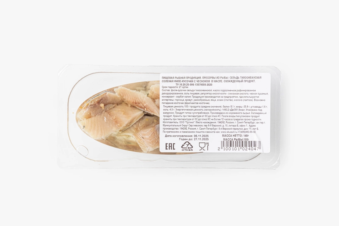 Сельдь тихоокеанская филе-кусочки с чесноком в масле, 140 г