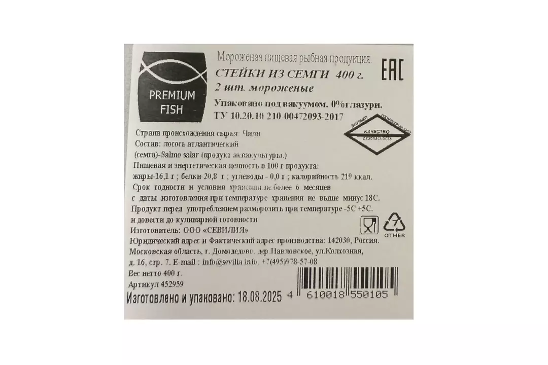 Представляем замороженные стейки семги весом 400 г, два идеально порционных куска, приготовленных из благородной рыбы с насыщенным вкусом. Шоковая заморозка сохраняет текстуру и пользу свежей семги, богатой Омега-3 жирными кислотами, белком и витаминами. Эти универсальные стейки — идеальный выбор для быстрого и вкусного ужина, будь то жарка на сковороде, запекание в духовке или приготовление на гриле. Страна производитель-Россия
