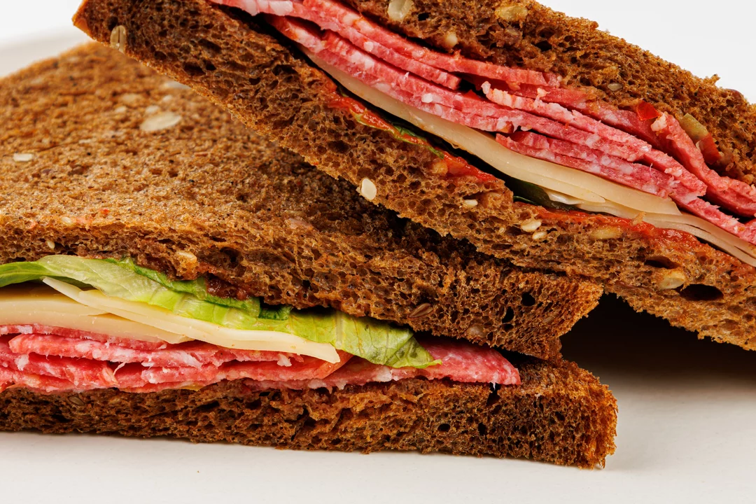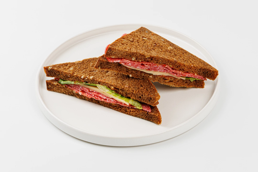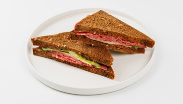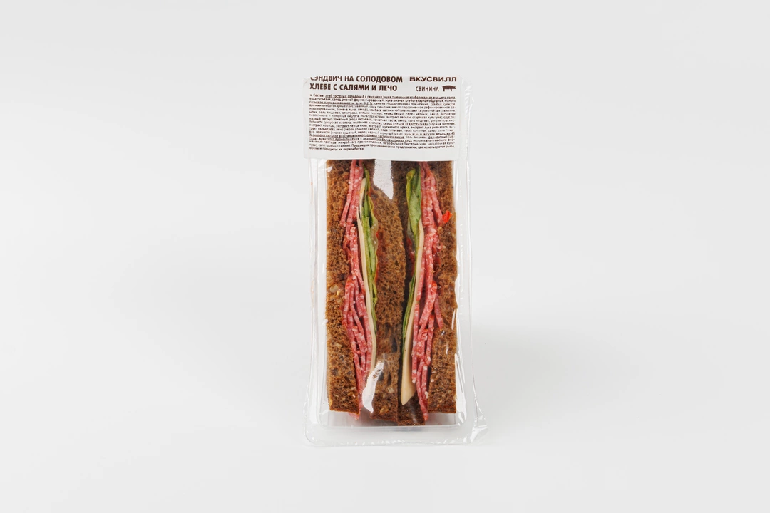Необычный сэндвич на солодовом хлебе с семенами кунжута, подсолнечника и льна. Внутри аппетитная начинка из сырокопчёной салями и ароматного лечо со специями. Мы добавили и классические ингредиенты: томатный соус и зелёные листья салата. А ещё положили кусочек сыра, который чуть расплавится при нагревании и придаст блюду особенно нежный оттенок. Это удобный и сытный перекус, его можно взять с собой на работу или в дорогу. Рекомендуем предварительно немного подогреть, чтобы насладиться не только вкусом, но и ароматом свежего поджаренного хлеба и душистых приправ.
