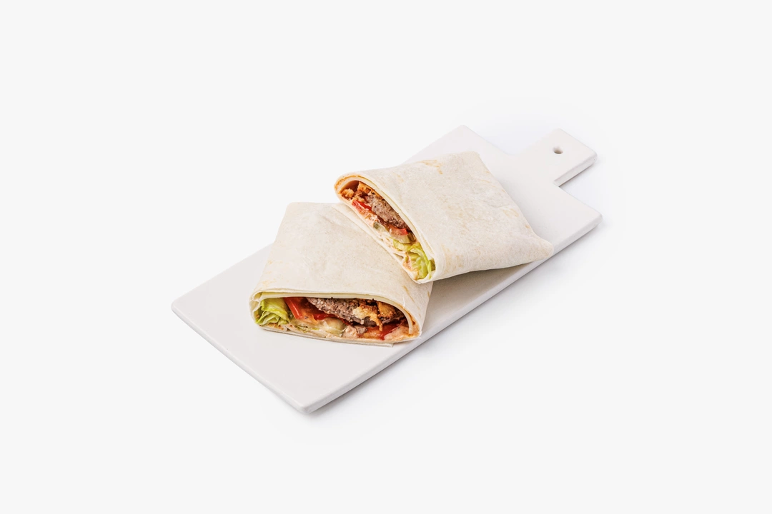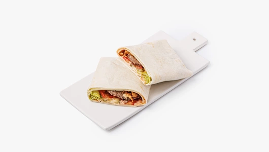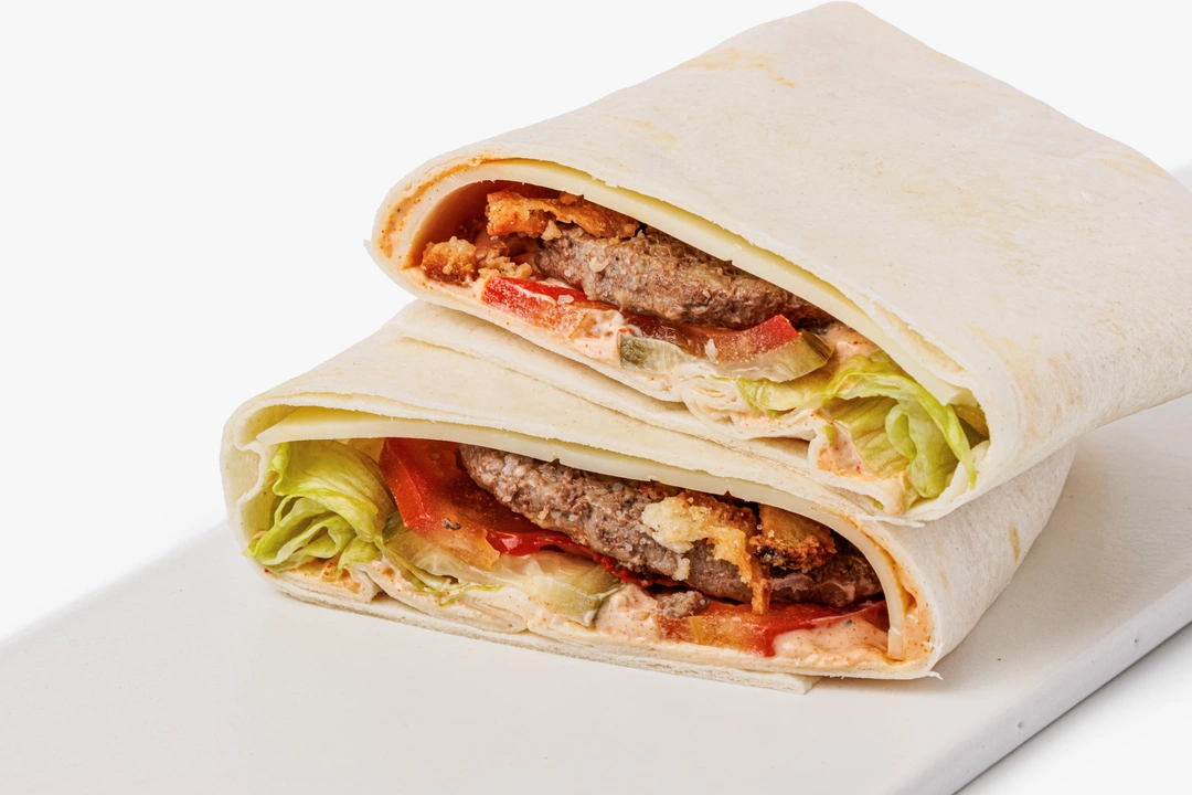 Пшеничная тортилья с начинкой в стиле классического бургера. Внутри — говяжья котлета с насыщенным мясным вкусом, расплавленный чеддер, свежий томат и салат романо. Соус «Бургер» с маринованными огурцами, горчицей и кетчупом добавляет характерную кисло-сладкую нотку и объединяет ингредиенты. Сэндвич-ролл лёгкий и компактный, его удобно есть даже на ходу, а послевкусие останется как после традиционного сытного бургера.