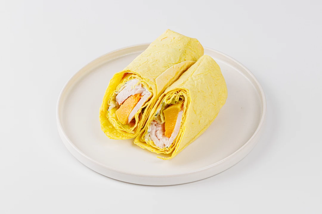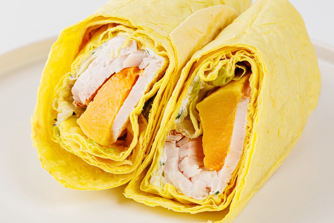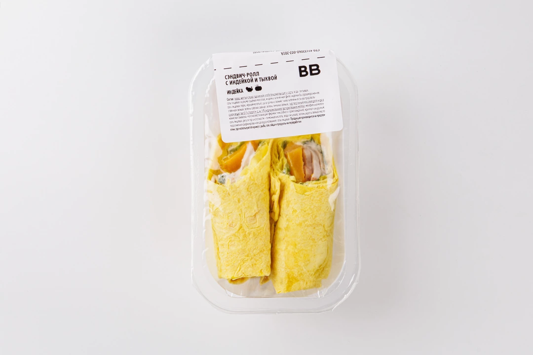 Сэндвич-ролл с лёгким, но сытным наполнением из индейки, тыквы, нежного творожного сыра, хрустящих листьев салата и свежей зелени. Тыква запечена с ароматным орегано и тимьяном и хорошо сочетается с птицей, а также придаёт начинке сочность. Лаваш приготовлен из пшеничной муки высшего сорта с добавлением пряной куркумы. В сэндвиче нет вредных соусов, консервантов и вкусовых добавок. А небольшую упаковку удобно брать с собой для быстрого перекуса в дороге или на работе.