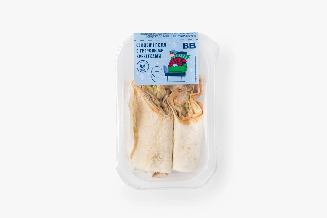 Лёгкий сэндвич-ролл с запечёнными тигровыми креветками и чуть пряным майонезно-томатным соусом, приготовленный для поклонников морепродуктов. Сочность роллу придаёт микс упругих салатных листьев и свежих огурчиков. А выразительности ему добавляет щепотка кайенского перца и дерзкий рыбный соус, завершая гурманскую симфонию вкуса.