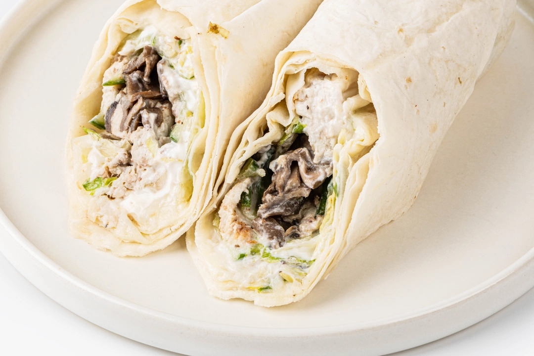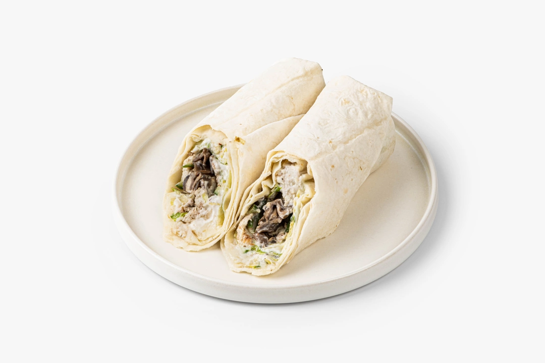 Мягкий пшеничный лаваш оборачивает сочную начинку, напоминающую домашний жульен. Куриное филе су-вид остаётся нежным и сочным, а жареные шампиньоны придают грибной вкус. Сливочная мягкость моцареллы связывает все ингредиенты, а свежие огурцы и листья айсберга добавляют лёгкость и немного хруста. Майонез делает вкус чуть пикантным и объединяет компоненты в гармоничную композицию. Такой ролл подойдёт для быстрого обеда или плотного перекуса.