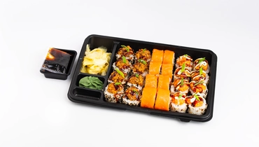 Фирменный сет из трех видов популярных роллов: Вулкан ролл с угрем (ролл с начинкой из японского отварного риса, сочного крабового сурими, творожного сыра и свежего огурца, под шапочкой рубленого копченого угря со спайси-соусом, обваленный в миксе черно-белого кунжута, сдобренный фирменными соусами и перьями зеленого лука), Цунами ролл (ролл с начинкой из творожного сыра, яичного омлета, свежего огурца, обваленный в жареной стружке нори, под опаленной шапочкой из слабосоленого лосося в спайси-соусе, придающий роллу дымное послевкусие, сдобрен фирменными соусами и перьями зеленого лука), Лайт фила ролл с креветкой под васаби соусом (ролл с начинкой из отварной креветки, творожного сыра и свежего огурца, под ломтиками слабосоленого лосося, сдобренный соусом васаби-лайм). Комплектуется с соевым соусом, маринованным имбирем, васаби.