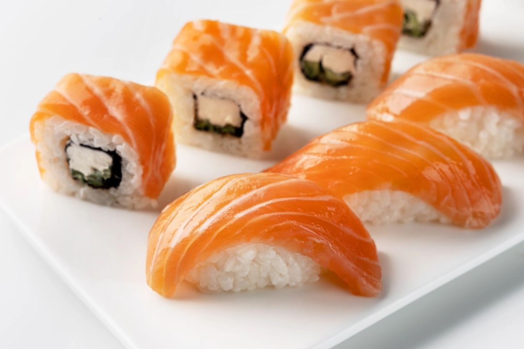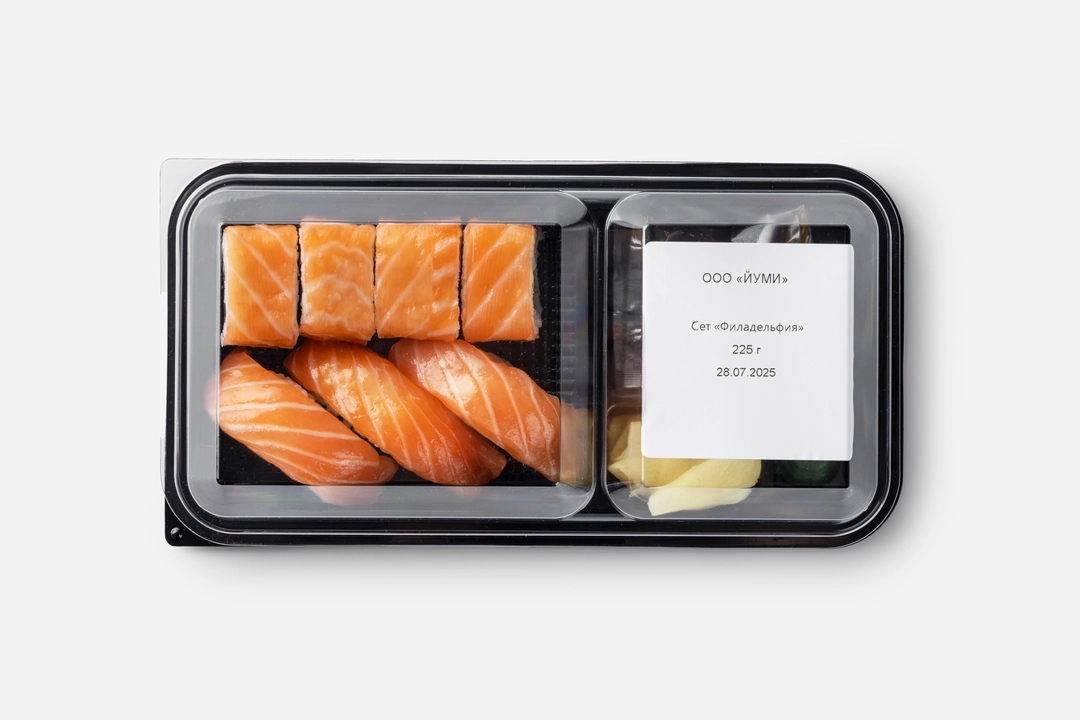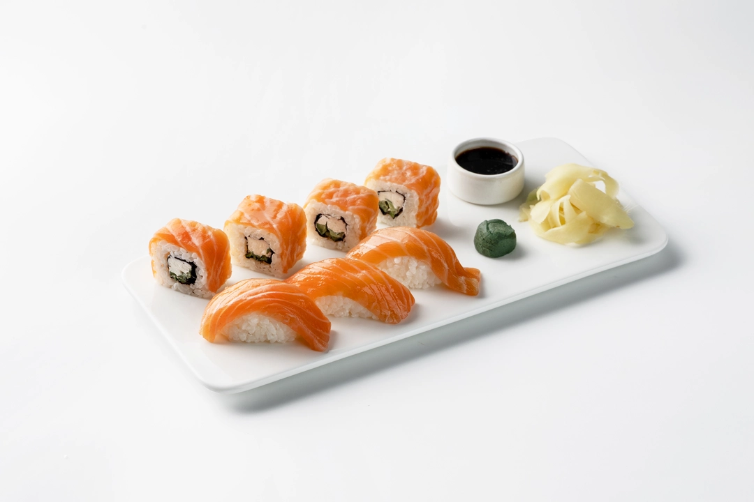 В набор входят роллы «Филадельфия» с атлантическим лососем, сливочным творожным сыром и свежим огурцом, а также суши с лососем. Классическое ассорти, в котором сочетаются нежность рыбы, сливочность сыра и лёгкая свежесть овощей.