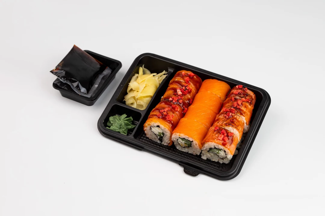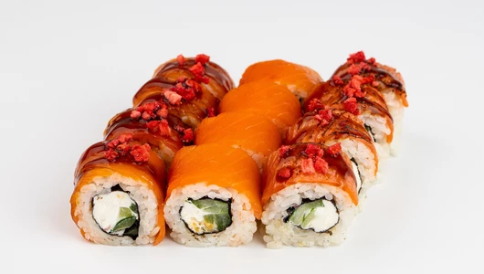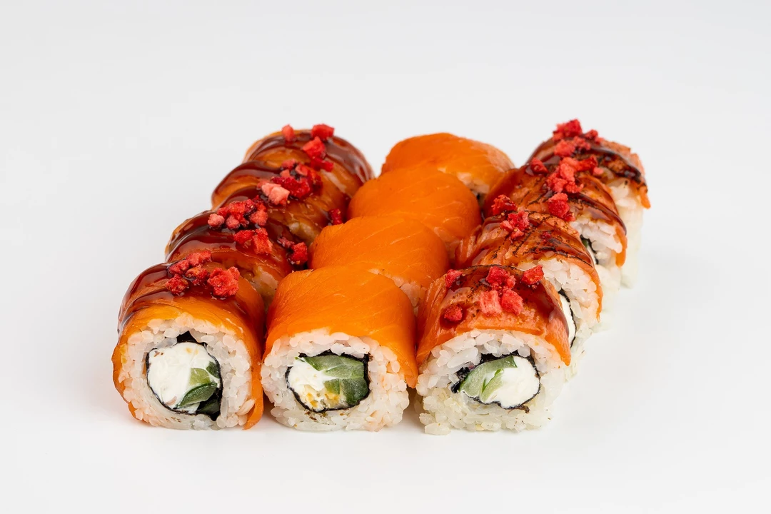 Мини сет (12 шт.) создан для тех, кто ценит идеальный баланс нежного лосося, сливочного сыра и неожиданных авторских решений. Джуси ролл - в основе жемчужный рис, хрустящий огурец и тающий сливочный сыр. Ролл бережно укутан ломтиками слабосоленого лосося, который подвергается деликатному обжигу: это дарит рыбе едва уловимый аромат дымка и невероятную нежность. Завершающий штрих — пряно-сладкий соус унаги и яркая посыпка из сублимированной клубники. Лайт филадельфия - сочетание свежего огурца и густого творожного сыра под слайсами слабосоленого лосося. Это ролл для тех, кто хочет насладиться чистым, эталонным вкусом благородной рыбы и прохладой овощной начинки. Бали ролл - изысканный баланс текстур и вкусовых нюансов. Нежный творожный сыр и освежающий огурец в объятиях тающего лосося, дополненные тягучей сладостью соуса унаги. Финальный аккорд — сублимированная клубника: она дарит легкую ягодную кислинку, превращая привычный ролл в настоящее гастрономическое событие. Три ролла — три настроения в одном сете. Позвольте себе это маленькое гастрономическое путешествие!