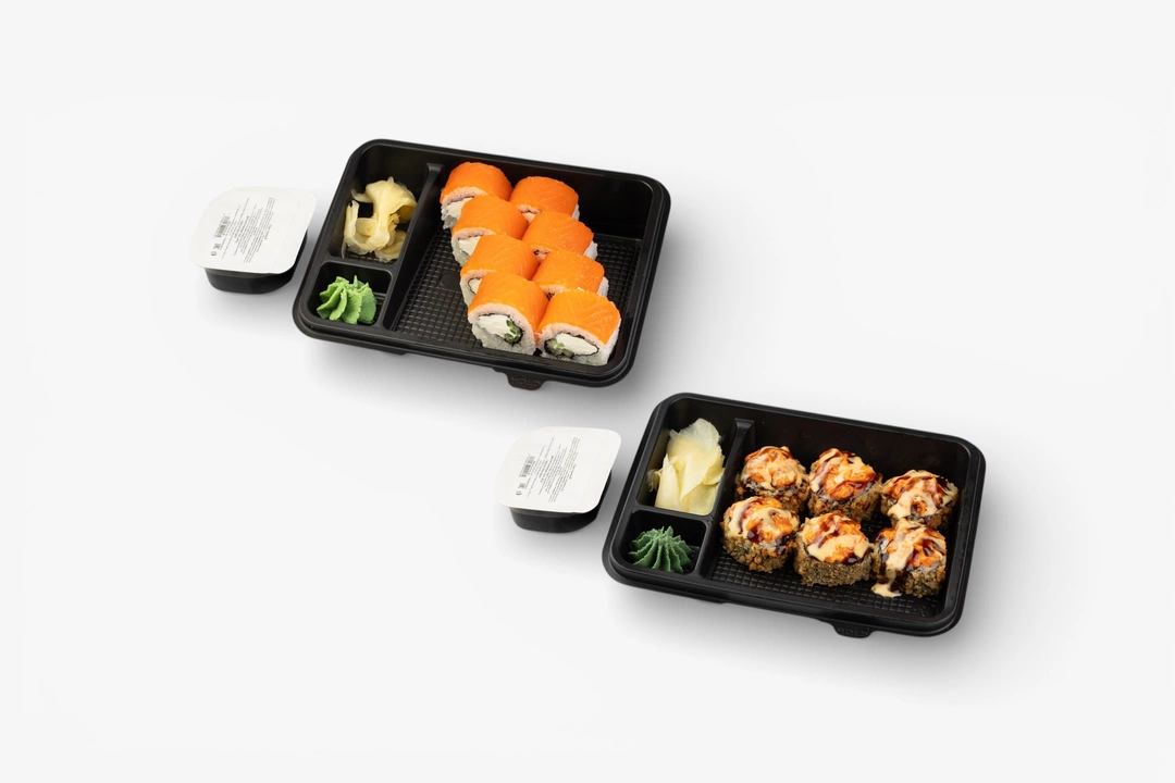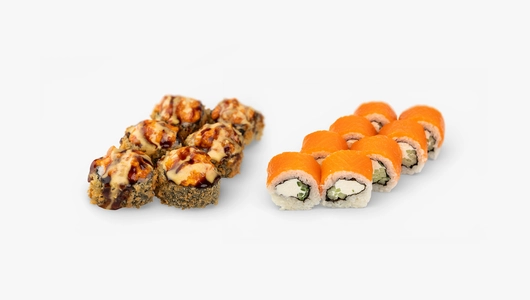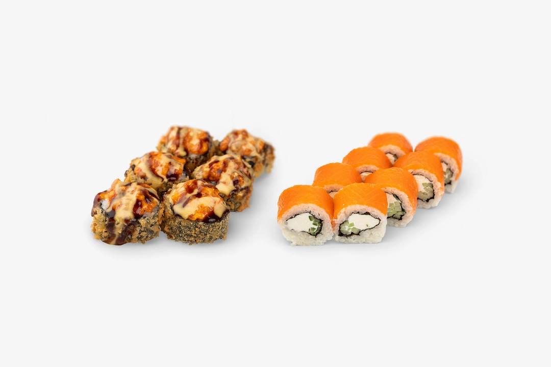 Этот сет - изысканный контраст прохладной классики и золотистого хруста, где благородный лосось представлен в двух ярких амплуа. Лайт филадельфия дарит эталонную нежность: ломтики слабосоленого лосося здесь идеально сочетаются со сливочным сыром и свежим огурцом. Противовесом выступает сытный Темпура-ролл с шапочкой из лосося. Его обжаренная в кляре база с творожным сыром и огурцом увенчана пикантной шапочкой из лосося в остром соусе спайси. Финальный штрих - экзотический дуэт манго-чили и унаги, придающий вкусу тропическую яркость. Обратите внимание: технология приготовления не подразумевает горячую подачу. Роллы подаются охлажденными, что позволяет сливочному сыру сохранять форму, а остроте соусов - раскрыться максимально чисто. Сет комплектуется традиционным набором из имбиря, васаби и соевого соуса.