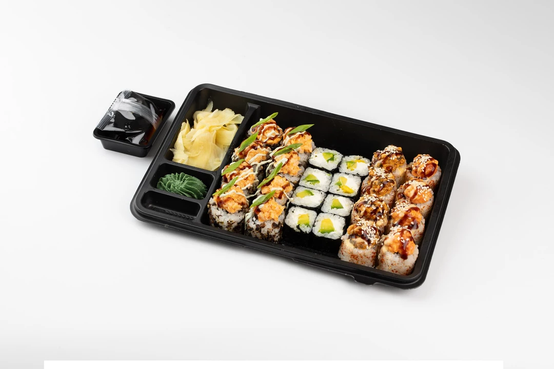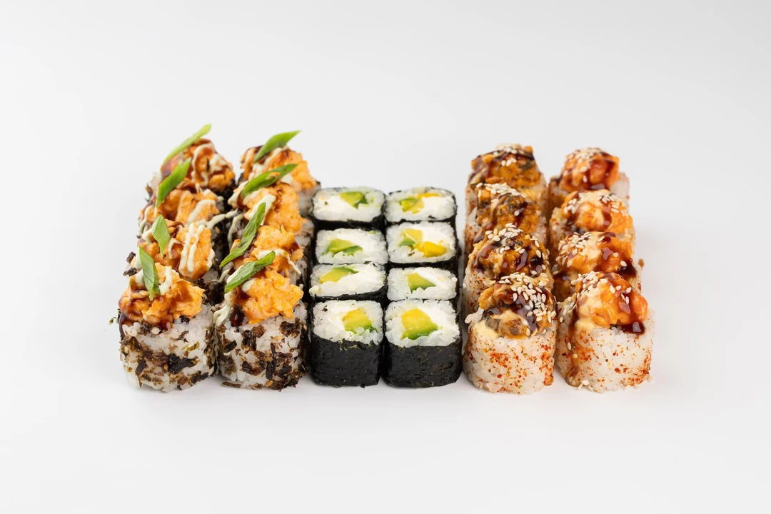 Сытный сет, наполненный разнообразием начинок, состоящий из трех видов роллов (по 8шт.): Вулкан с креветкой (ролл с начинкой из японского отварного риса, творожного сыра и свежего огурца, обваленный в жареном нори с кунжутом, под шапочкой рубленых креветок в спайси соусе, сдобренный фирменными соусами и перьями зеленого лука), Острый ролл с шапкой из лосося и угря (пряно-острый ролл, обсыпанный жгучим перцем шичими, с начинкой из нежного творожного сыра, хрустящего свежего огурца, под шапочкой из рубленого слабосоленого лосося и копченого угря, заправленные спайси-соусом, сдобрен пряными соусами), Аво чиз (ролл с авокадо и творожным сыром). Комплектуется с имбирем маринованным, васаби и соевым соусом.