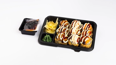 рис отварной (крупа рисовая, вода, соус рисовый (уксус рисовый (вода, рисовый уксус, уксусная кислота, сахар, соль), сахар, соль), фарш спайс: жареное филе угря в соусе проложенное (угорь речной (продукция аквакультуры, произведено из мороженного сырья), соевый соус (вода, соя, соль), сахар, кукурузный сироп и крахмал), крабовые сурими (рыбный фарш (мясо рыбы (морской лещ, летучая рыба, минтай, нитепёр полосатый, окунь розовый), сахар), вода, крахмал картофельный и кукурузный, масло подсолнечное, соль, сахар, яичный белок, ароматизатор пищевой (натуральные вкусоматические вещества, носитель-пропиленгликоль), загуститель-каррагинан, краситель натуральный-экстракт паприки) лосось (филе сёмги с/с (лосось атлантический (сёмга) (произведено из охлаждённого сырья), соль, сахар), соус спайс (майонез мдж 67% (масло подсолнечное и масло оливковое рафинированное дезодорированное, вода, сахар, яичный желток жидкий, соль, лимонный сок, уксус спиртовой 20 %, горчичное мало нерафинированное), соевый соус (вода, соевые бобы, пшеница, соль, сахар), перец красный молотый), сыр творожный мдж 65% (творог (нормализованное пастеризованное молоко, бактериальная закваска, молокосвертывающий фермент микробного происхождения), загуститель-дикрахмаладипат ацетилированный, соль, стабилизаторы (камедь рожкового дерева, гуаровая камедь), регулятор кислотности- лимонная кислота, вода), кляр (мука темпурная (мука пшеничная хлебопекарная высшего сорта, крахмал кукурузный, соль, чеснок сушеный молотый, лук репчатый сушеный молотый, разрыхлитель-гидрокарбонат натрия), вода), сухари панировочные (мука пшеничная хлебопекарная высшего сорта, дрожжи сухие хлебопекарные, соль, сахар), масло подсолнечное), масло фритюрное (масло подсолнечное рафинированное дезодорированное), огурец свежий, водоросли нори сушеные, соевый соус (вода, соевые бобы, пшеница, соль, сахар), имбирь маринованный (корень имбиря свежий, уксус рисовый, соль, сахар), васаби (вода, васаби порошок (порошок хрена, горчичный порошок, крахмал кукурузный, соль, антиокислитель-аскорбиновая кислота), порошок спирулины). Продукция производится на предприятии, где используются рыба, моллюски, ракообразные, яйца, молоко, кунжут, сельдерей, орехи и продукты их переработки. Возможно попадание в продукт фрагментов костей рыбы.